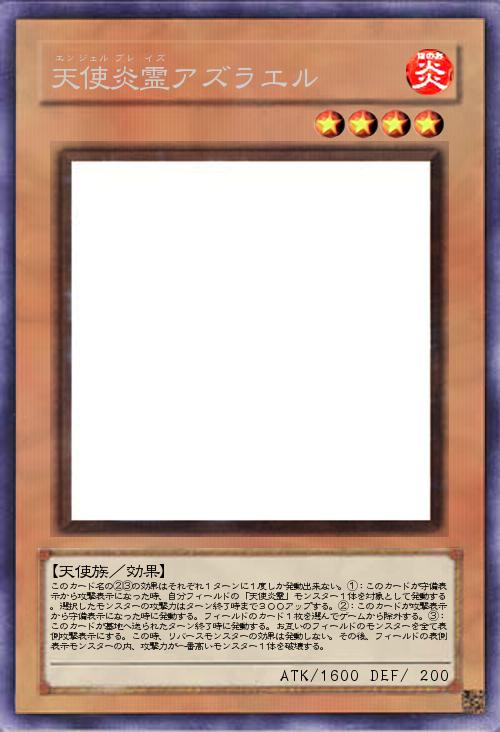 | このカード名の②③の効果はそれぞれ1ターンに1度しか発動出来ない。①:このカードが守備表示から攻撃表示になった時、自分フィールドの「天使炎霊」モンスター1体を対象として発動する。選択したモンスターの攻撃力はターン終了時まで300アップする。②:このカードが攻撃表示から守備表示になった時に発動する。フィールドのカード1枚を選んでゲームから除外する。③:このカードが墓地へ送られたターン終了時に発動する。お互いのフィールドのモンスターを全て表側攻撃表示にする。この時、リバースモンスターの効果は発動しない。その後、フィールドの表側表示モンスターの内、攻撃力が一番高いモンスター1体を破壊する。 | |||