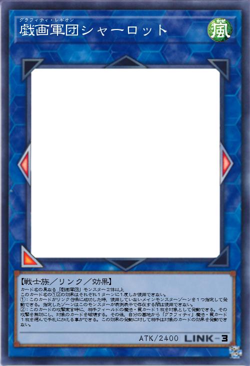 | カード名の異なる「戯画軍団」モンスター2体以上 このカード名の①②の効果はそれぞれ1ターンに1度しか使用できない。 ①:このカードがリンク召喚に成功した時、使用していないメインモンスターゾーンを1つ指定して発動できる。指定したゾーンはこのモンスターが表側表示で存在する間は使用できない。 ②:このカードの攻撃宣言時に、相手フィールドの魔法・罠カード1枚を対象として発動できる。その攻撃を無効にし、対象のカードを破壊する。その後、自分の墓地から「グラフィティ」魔法・罠カード1枚を選んで手札に加える事ができる。この効果の発動に対して相手は対象のカードの効果を発動できない。 | |||