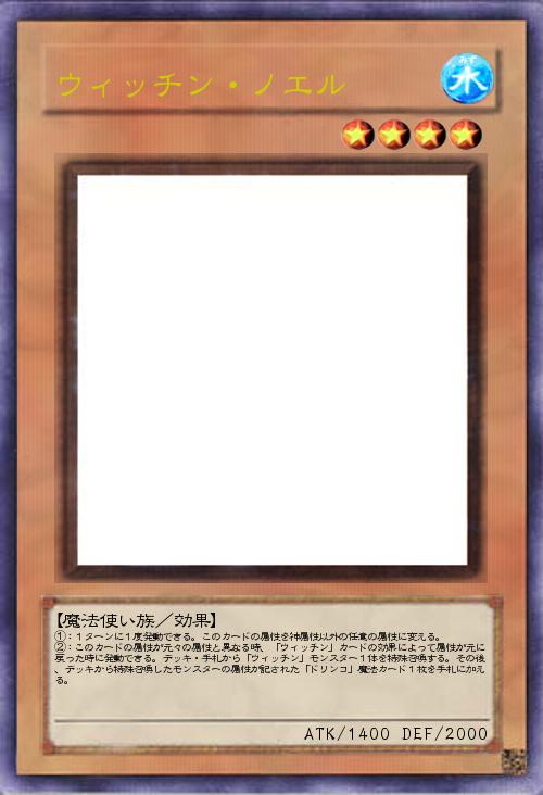 | ①:1ターンに1度発動できる。このカードの属性を神属性以外の任意の属性に変える。 ②:このカードの属性が元々の属性と異なる時、「ウィッチン」カードの効果によって属性が元に戻った時に発動できる。デッキ・手札から「ウィッチン」モンスター1体を特殊召喚する。その後、デッキから特殊召喚したモンスターの属性が記された「ドリンコ」魔法カード1枚を手札に加える。 | |||