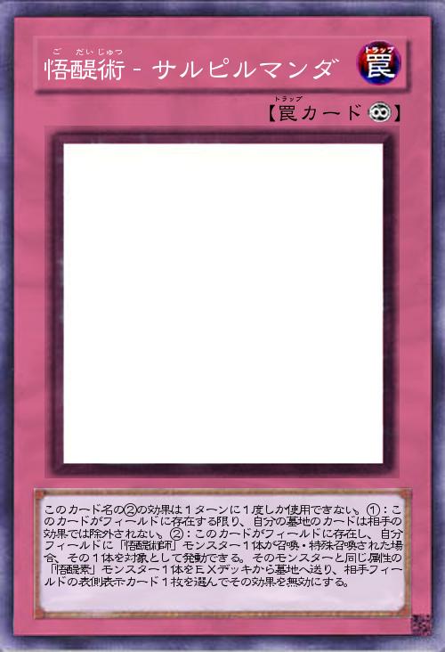 | このカード名の②の効果は1ターンに1度しか使用できない。①:このカードがフィールドに存在する限り、自分の墓地のカードは相手の効果では除外されない。②:このカードがフィールドに存在し、自分フィールドに「悟醍術師」モンスター1体が召喚・特殊召喚された場合、その1体を対象として発動できる。そのモンスターと同じ属性の「悟醍素」モンスター1体をEXデッキから墓地へ送り、相手フィールドの表側表示カード1枚を選んでその効果を無効にする。 | |||