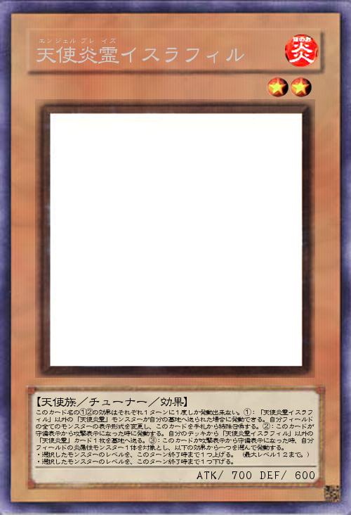 | このカード名の①②の効果はそれぞれ1ターンに1度しか発動出来ない。①:「天使炎霊イスラフィル」以外の「天使炎霊」モンスターが自分の墓地へ送られた場合に発動できる。自分フィールドの全てのモンスターの表示形式を変更し、このカードを手札から特殊召喚する。②:このカードが守備表示から攻撃表示になった時に発動する。自分のデッキから「天使炎霊イスラフィル」以外の「天使炎霊」カード1枚を墓地へ送る。③:このカードが攻撃表示から守備表示になった時、自分フィールドの炎属性モンスター1体を対象とし、以下の効果から一つを選んで発動する。 ・選択したモンスターのレベルを、このターン終了時まで1つ上げる。(最大レベル12まで。) ・選択したモンスターのレベルを、このターン終了時まで1つ下げる。 | |||
