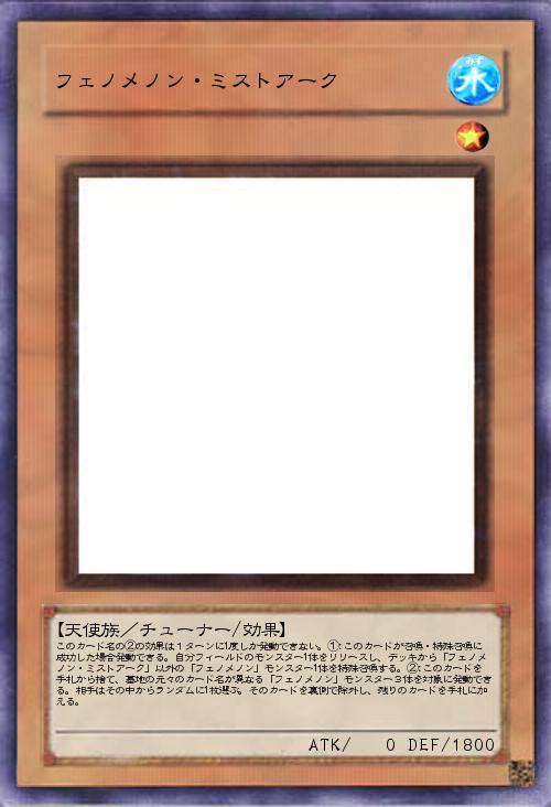 | このカード名の②の効果は1ターンに1度しか発動できない。①:このカードが召喚・特殊召喚に成功した場合発動できる。自分フィールドのモンスター1体をリリースし、デッキから「フェノメノン・ミストアーク」以外の「フェノメノン」モンスター1体を特殊召喚する。②:このカードを手札から捨て、墓地の元々のカード名が異なる「フェノメノン」モンスター3体を対象に発動できる。相手はその中からランダムに1枚選ぶ。そのカードを裏側で除外し、残りのカードを手札に加える。 | |||