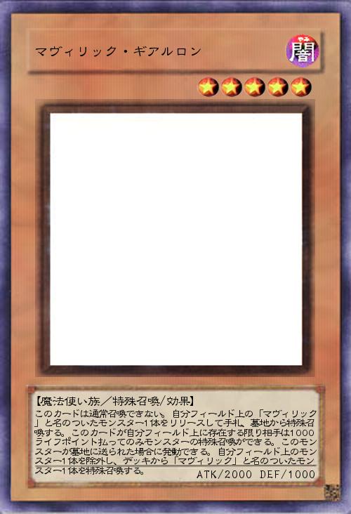 | このカードは通常召喚できない。自分フィールド上の「マヴィリック」と名のついたモンスター1体をリリースして手札、墓地から特殊召喚する。このカードが自分フィールド上に存在する限り相手は1000ライフポイント払ってのみモンスターの特殊召喚ができる。このモンスターが墓地に送られた場合に発動できる。自分フィールド上のモンスター1体を除外し、デッキから「マヴィリック」と名のついたモンスター1体を特殊召喚する。 | |||
