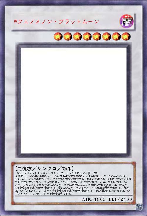 | 「Wフェノメノン」モンスターのチューナー+シンクロモンスター1体 このカード名の②の効果は1ターンに1度しか発動できない。①:このカードが「Wフェノメノン」モンスターのみを素材としてS召喚された場合発動できる。お互いの裏側表示で除外されているカードを全てデッキ戻す。その後自分フィールドのモンスターの攻撃力・守備力を戻した数×100アップすることができるを②:このカードが特殊召喚に成功した場合に発動できる。墓地のカードを合計5枚まで裏側表示で除外する。③:このカードがフィールドから離れた場合発動する。自分墓地の「フェノメノン」カードを合計3枚まで裏側表示で除外する。その後除外した数まで墓地の「フェノメノン」モンスターを特殊召喚できる。 | |||