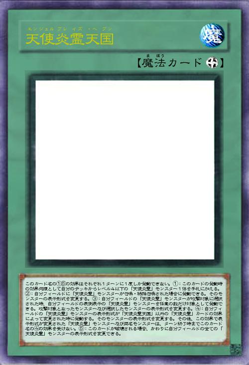 | このカード名の①⑤の効果はそれぞれ1ターンに1度しか発動できない。①:このカードの発動時の効果処理として自分のデッキからレベル4以下の「天使炎霊」モンスター1体を手札に加える。②:自分フィールドに「天使炎霊」モンスターが召喚・特殊召喚された場合に発動できる。そのモンスターの表示形式を変更する。③:自分フィールドの「天使炎霊」モンスターが攻撃対象に選択された時、自分フィールドの表側表示の「天使炎霊」モンスターを任意の数だけ対象として発動できる。攻撃対象となったモンスター及び選択したモンスターの表示形式を変更する。④:自分フィールドの「天使炎霊」モンスターの表示形式が「天使炎霊天国」以外の「天使炎霊」カードの効果によって変更された時に発動する。そのモンスターの表示形式を変更する。その後、この効果で表示形式が変更された「天使炎霊」モンスター及び同名モンスターは、ターン終了時までこのカード名の④の | |||