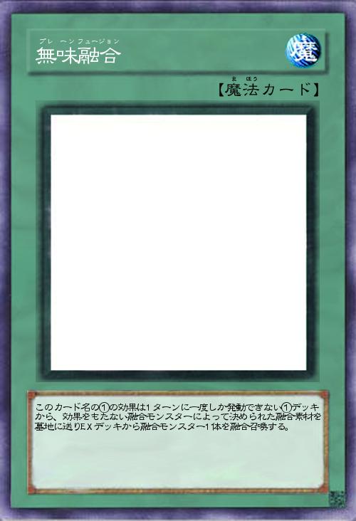 | このカード名の①の効果は1ターンに一度しか発動できない①デッキから、効果をもたない融合モンスターによって決められた融合素材を墓地に送りEXデッキから融合モンスター1体を融合召喚する。 | |||