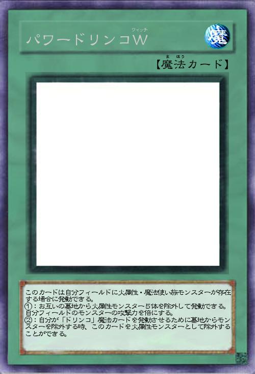 | このカードは自分フィールドに火属性・魔法使い族モンスターが存在する場合に発動できる。 ①:お互いの墓地から火属性モンスター5体を除外して発動できる。自分フィールドのモンスターの攻撃力を倍にする。 ②:自分が「ドリンコ」魔法カードを発動させるために墓地からモンスターを除外する時、このカードを火属性モンスターとして除外することができる。 | |||