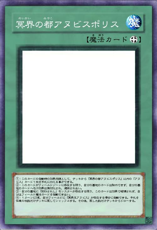 | ①:このカードの発動時の効果処理として、デッキから「冥界の都アヌビスポリス」以外の「アヌビス」カード1枚を手札に加える事ができる。 ②:このカードがフィールドゾーンに存在する限り、自分の墓地のカードは除外できず、自分の墓地のカードへ及ぶ効果は無効化され、適用されない。 ③:自分の墓地に「封印されし」モンスターが存在する限り、このカードは効果で破壊されず、自分はフィールド魔法カードを発動できない。 ④:1ターンに1度、自分フィールドに「冥界王アヌビス」が存在する場合に発動できる。手札を任意の枚数だけデッキに戻してシャッフルする。その後、戻した数だけデッキからドローする。 | |||