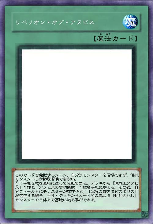 | このカードを発動するターン、自分はモンスターを召喚できず、儀式モンスターしか特殊召喚できない。 ①:手札2枚を墓地に送って発動できる。デッキから「冥界王アヌビス」1体と「アヌビスの契約儀式」1枚を手札に加える。その後、自分フィールドにモンスターが存在せず、「冥界の都アヌビスポリス」が存在する場合、手札・デッキからカード名の異なる「封印されし」モンスターを5体まで墓地に送る事ができる。 | |||