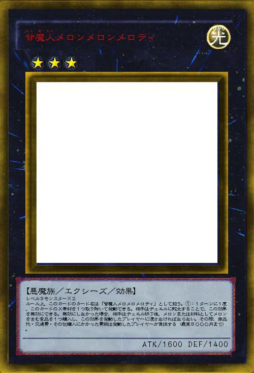 | レベル3モンスター×2 ルール上、このカードのカード名は「管魔人メロメロメロディ」として扱う。①:1ターンに1度、このカードのX素材を1つ取り除いて発動できる。相手はデュエルに敗北することで、この効果を無効にできる。無効にしなかった場合、相手はデュエル終了後、メロンまたは材料としてメロンを含む食品を1つ購入し、この効果を発動したプレイヤーに渡さなければならない。その際、商品代・交通費・その他購入にかかった費用は発動したプレイヤーが負担する(最高5000円まで)。 | |||