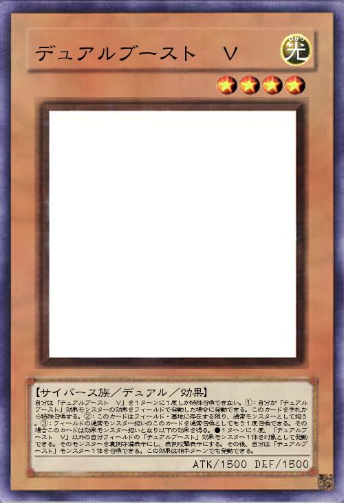 | 自分は「デュアルブースト V」を1ターンに1度しか特殊召喚できない。①:自分が「デュアルブースト」効果モンスターの効果をフィールドで発動した場合に発動できる。このカードを手札から特殊召喚する。②:このカードはフィールド・墓地に存在する限り、通常モンスターとして扱う。③:フィールドの通常モンスター扱いのこのカードを通常召喚としてもう1度召喚できる。その場合このカードは効果モンスター扱いとなり以下の効果を得る。●1ターンに1度、「デュアルブースト V」以外の自分フィールドの「デュアルブースト」効果モンスター1体を対象として発動できる。そのモンスターを裏側守備表示にし、表側攻撃表示にする。その後、自分は「デュアルブースト」モンスター1体を召喚できる。この効果は相手ターンでも発動できる。 | |||