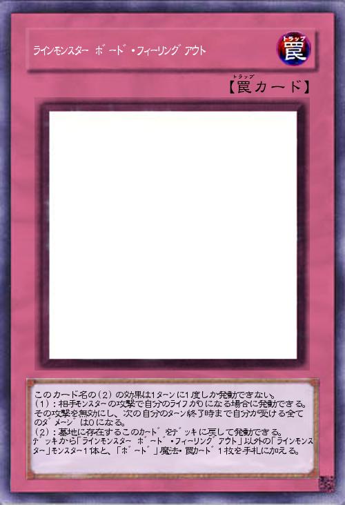 | このカード名の(2)の効果は1ターンに1度しか発動できない。 (1):相手モンスターの攻撃で自分のライフが0になる場合に発動できる。 その攻撃を無効にし、次の自分のターン終了時まで自分が受ける全てのダメージは0になる。 (2):墓地に存在するこのカードをデッキに戻して発動できる。 デッキから「ラインモンスター ボード・フィーリングアウト」以外の「ラインモンスター」モンスター1体と、「ボード」魔法・罠カード1枚を手札に加える。 | |||