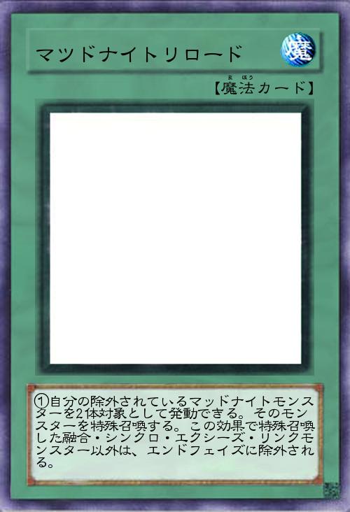 | ①自分の除外されているマッドナイトモンスターを2体対象として発動できる。そのモンスターを特殊召喚する。この効果で特殊召喚した融合・シンクロ・エクシーズ・リンクモンスター以外は、エンドフェイズに除外される。 | |||