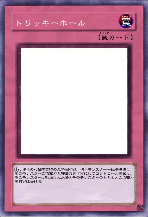 | ①:相手の攻撃宣言時のみ発動可能。相手モンスター一体を選択し、そのモンスターの攻撃力と守備力を半分にしてコントロールを奪う。そのモンスターが破壊された場合そのモンスターのもともとの攻撃力を自分は受ける。 | |||