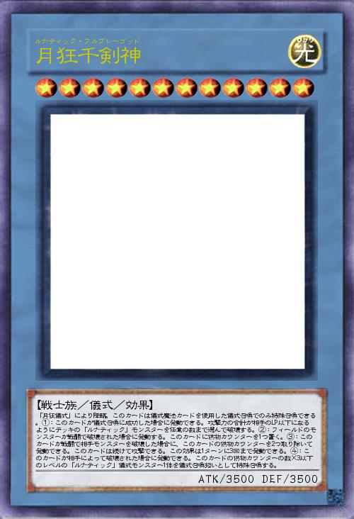 | 「月狂儀式」により降臨。このカードは儀式魔法カードを使用した儀式召喚でのみ特殊召喚できる。①:このカードが儀式召喚に成功した場合に発動できる。攻撃力の合計が相手のLP以下になるようにデッキの「ルナティック」モンスターを任意の数まで選んで破壊する。②:フィールドのモンスターが戦闘で破壊された場合に発動する。このカードに供物カウンターを1つ置く。③:このカードが戦闘で相手モンスターを破壊した場合に、このカードの供物カウンターを2つ取り除いて発動できる。このカードは続けて攻撃できる。この効果は1ターンに3回まで発動できる。④:このカードが相手によって破壊された場合に発動できる。このカードの供物カウンターの数×3以下のレベルの「ルナティック」儀式モンスター1体を儀式召喚扱いとして特殊召喚する。 | |||