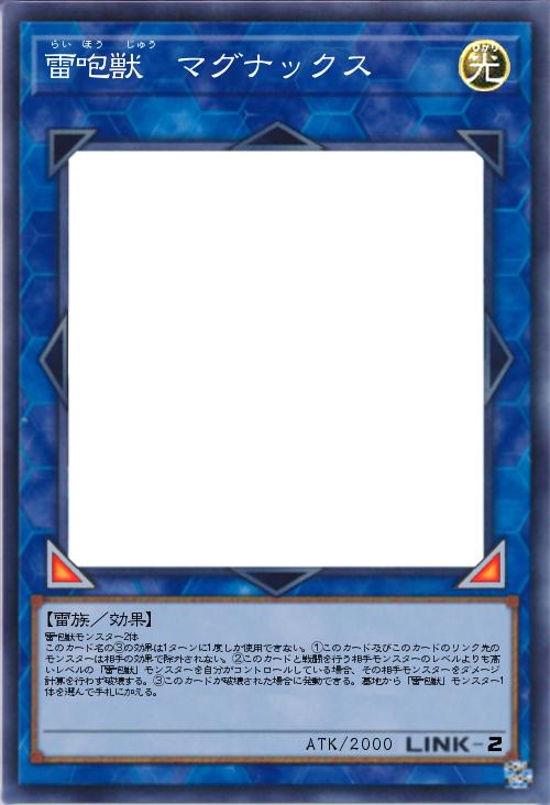 | 雷咆獣モンスター2体 このカード名の③の効果は1ターンに1度しか使用できない。①このカード及びこのカードのリンク先のモンスターは相手の効果で除外されない。②このカードと戦闘を行う相手モンスターのレベルよりも高いレベルの「雷咆獣」モンスターを自分がコントロールしている場合、その相手モンスターをダメージ計算を行わず破壊する。③このカードが破壊された場合に発動できる。墓地から「雷咆獣」モンスター1体を選んで手札に加える。 | |||