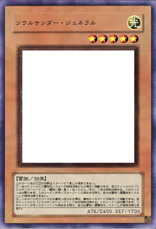 | このカード名の①②の効果は1ターンに1度しか使用できない。 ①:自分フィールドに雷族モンスターが特殊召喚された場合に発動できる。自分フィールドに「ソウルサンダートークン」(雷族・闇・星1・攻1000/守0)1体を特殊召喚する。このトークンは攻撃できず、このトークンがモンスターゾーンに存在する限り、自分は雷族・闇属性モンスターしか特殊召喚できない。 ②:このカードがリリースされ墓地へ送られた場合、墓地のこのカードを除外して発動できる。自分フィールドに「ソウルサンダートークン」1体を特殊召喚する。このトークンは攻撃できず、このトークンがモンスターゾーンに存在する限り、自分は雷族・闇属性モンスターしか特殊召喚できない。 | |||