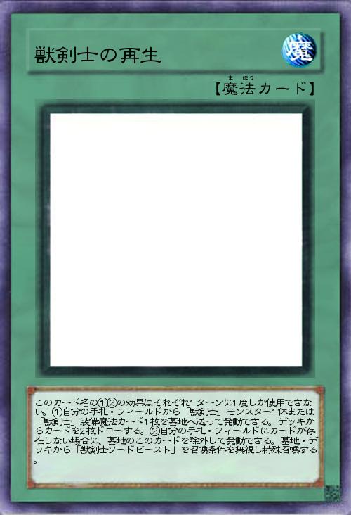 | このカード名の①②の効果はそれぞれ1ターンに1度しか使用できない。①自分の手札・フィールドから「獣剣士」モンスター1体または「獣剣士」装備魔法カード1枚を墓地へ送って発動できる。デッキからカードを2枚ドローする。②自分の手札・フィールドにカードが存在しない場合に、墓地のこのカードを除外して発動できる。墓地・デッキから「獣剣士ソードビースト」を召喚条件を無視し特殊召喚する。 | |||