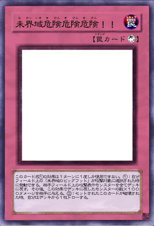 | このカード名①の効果は1ターンに1度しか使用できない。①:自分フィールド上の「未界域のビッグフット」が攻撃対象に選択された時に発動できる。相手フィールド上の攻撃表示モンスターを全てデッキに戻す。その後、この効果でデッキに戻したモンスターの数×1000ダメージを相手に与える。②:セットされたこのカードが破壊された時、自分はデッキから1枚ドローする。 | |||