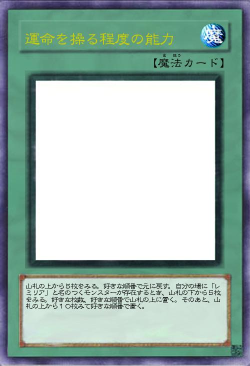| 山札の上から5枚をみる。好きな順番で元に戻す。自分の場に「レミリア」と名のつくモンスターが存在するとき、山札の下から5枚をみる。好きな枚数、好きな順番で山札の上に置く。そのあと、山札の上から10枚みて好きな順番で置く。 | |||