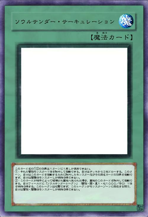 | このカード名の①②の効果は1ターンに1度しか使用できない。 ①:手札の雷族モンスター1体を除外して発動できる。自分はデッキから2枚ドローする。このターン、自分はこのカードを発動するために除外したモンスター及びその同名カードの効果を発動できず、自分は闇属性モンスターしか特殊召喚できない。 ②:このカードが相手によって破壊され墓地へ送られた場合、墓地のこのカードを除外して発動できる。自分フィールドに「ソウルサンダートークン」(雷族・闇・星1・攻1000/守0)1体を特殊召喚する。このトークンは攻撃できず、このトークンがモンスターゾーンに存在する限り、自分は雷族・闇属性モンスターしか特殊召喚できない。 | |||