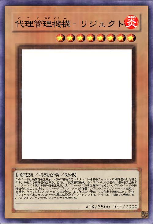| このカードは通常召喚出来ず、相手の墓地のモンスター1体を相手フィールドに特殊召喚した場合のみ、手札から特殊召喚出来る。自分は「代理管理機構」モンスター以外を召喚・特殊召喚出来ず。1ターンに1度のみ特殊召喚出来る。①このカードの効果は無効にならない。②このカードの特殊召喚に成功した場合、このカードにSカウンターを5個置く。②このカードがフィールドを離れる場合、代わりにSカウンターを1つ取り除く。取り除けない場合、この効果を発動しない。③相手フィールド上のモンスターの攻撃力は1000ポイントダウンする。④手札を1枚捨てて発動する。エクストラゾーンのモンスターを全て破壊する。 | |||