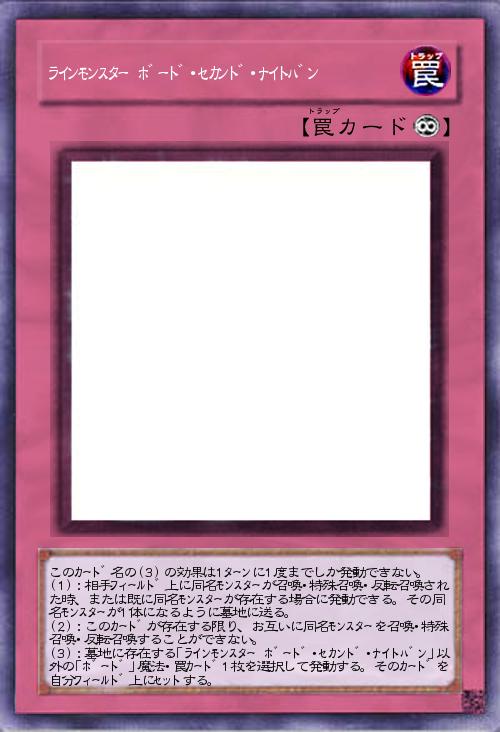 | このカード名の(3)の効果は1ターンに1度までしか発動できない。 (1):相手フィールド上に同名モンスターが召喚・特殊召喚・反転召喚された時、または既に同名モンスターが存在する場合に発動できる。その同名モンスターが1体になるように墓地に送る。 (2):このカードが存在する限り、お互いに同名モンスターを召喚・特殊召喚・反転召喚することができない。 (3):墓地に存在する「ラインモンスター ボード・セカンド・ナイトバン」以外の「ボード」魔法・罠カード1枚を選択して発動する。そのカードを自分フィールド上にセットする。 | |||