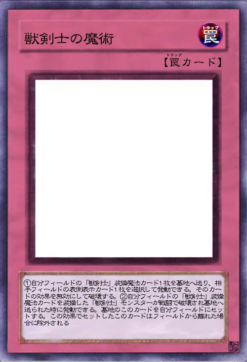 | ①自分フィールドの「獣剣士」装備魔法カード1枚を墓地へ送り、相手フィールドの表側表示カード1枚を選択して発動できる。そのカードの効果を無効にして破壊する。②自分フィールドの「獣剣士」装備魔法カードを装備した「獣剣士」モンスターが戦闘で破壊され墓地へ送られた時に発動できる。墓地のこのカードを自分フィールドにセットする。この効果でセットしたこのカードはフィールドから離れた場合に除外される | |||
