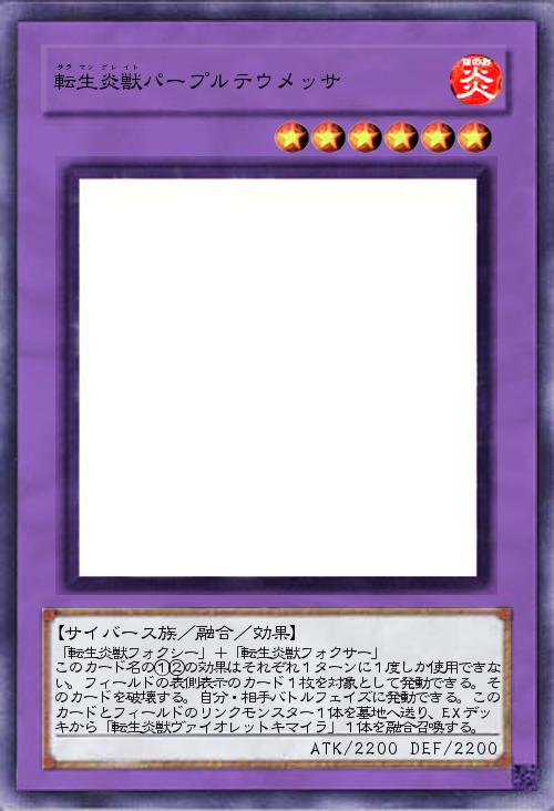 | 「転生炎獣フォクシー」+「転生炎獣フォクサー」 このカード名の①②の効果はそれぞれ1ターンに1度しか使用できない。フィールドの表側表示のカード1枚を対象として発動できる。そのカードを破壊する。自分・相手バトルフェイズに発動できる。このカードとフィールドのリンクモンスター1体を墓地へ送り、EXデッキから「転生炎獣ヴァイオレットキマイラ」1体を融合召喚する。 | |||