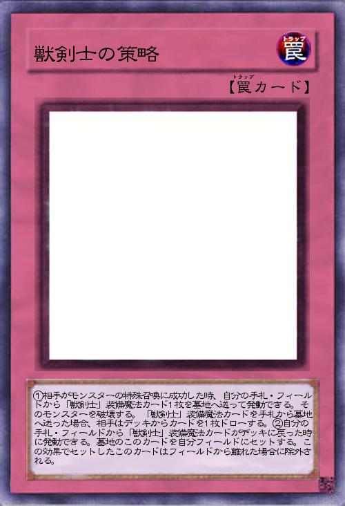 | ①相手がモンスターの特殊召喚に成功した時、自分の手札・フィールドから「獣剣士」装備魔法カード1枚を墓地へ送って発動できる。そのモンスターを破壊する。「獣剣士」装備魔法カードを手札から墓地へ送った場合、相手はデッキからカードを1枚ドローする。②自分の手札・フィールドから「獣剣士」装備魔法カードがデッキに戻った時に発動できる。墓地のこのカードを自分フィールドにセットする。この効果でセットしたこのカードはフィールドから離れた場合に除外される。 | |||