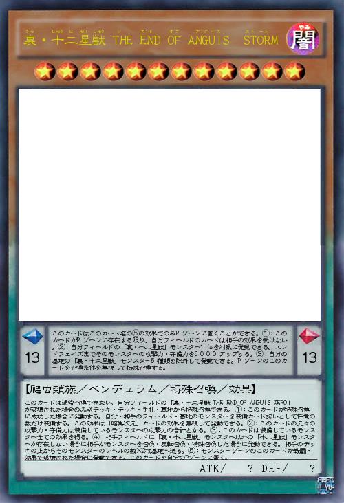 | このカードは通常召喚できない。自分フィールドの「裏・十二星獣 THE END OF ANGUIS ZERO」が破壊された場合のみEXデッキ・デッキ・手札・墓地から特殊召喚できる。①:このカードが特殊召喚に成功した場合に発動する。自分・相手のフィールド・墓地のモンスターを装備カード扱いとして任意の数だけ装備する。この効果は「暗黒次元」カードの効果を無視して発動できる。②:このカードの元々の攻撃力・守備力は装備しているモンスターの攻撃力の合計となる。③:このカードは装備しているモンスター全ての効果を得る。④:相手フィールドに「裏・十二星獣」モンスター以外の「十二星獣」モンスターが存在しない場合に相手がモンスターを召喚・反転召喚・特殊召喚した場合に発動できる。相手のデッキの上からそのモンスターのレベルの数×2枚墓地へ送る。⑤:モンスターゾーンのこのカードが戦闘・効果で破壊された場合に発動できる。 | |||