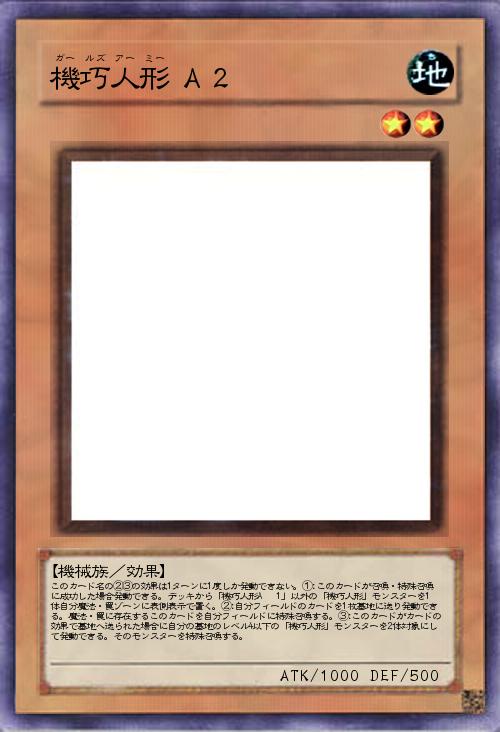 | このカード名の②③の効果は1ターンに1度しか発動できない。①:このカードが召喚・特殊召喚に成功した場合発動できる。デッキから「機巧人形A 1」以外の「機巧人形」モンスターを1体自分魔法・罠ゾーンに表側表示で置く。②:自分フィールドのカードを1枚墓地に送り発動できる。魔法・罠に存在するこのカードを自分フィールドに特殊召喚する。③:このカードがカードの効果で墓地へ送られた場合に自分の墓地のレベル4以下の「機巧人形」モンスターを2体対象にして発動できる。そのモンスターを特殊召喚する。 | |||