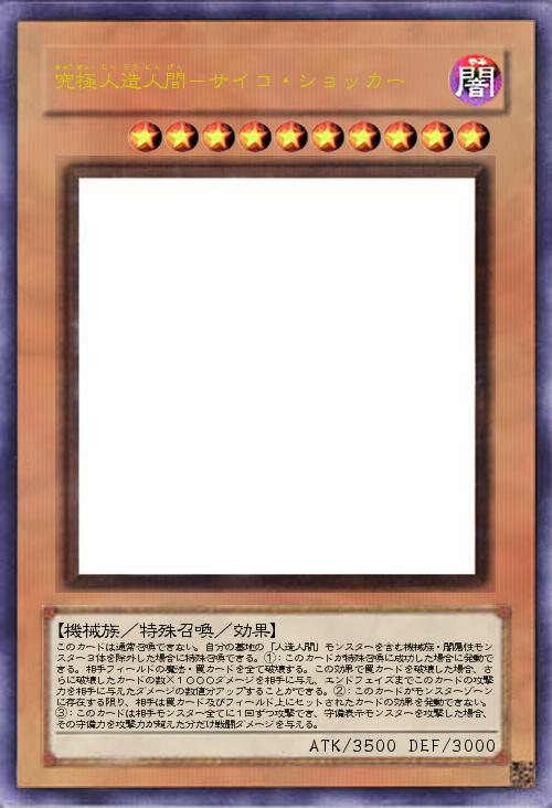 | このカードは通常召喚できない。自分の墓地の「人造人間」モンスターを含む機械族・闇属性モンスター3体を除外した場合に特殊召喚できる。①:このカードが特殊召喚に成功した場合に発動できる。相手フィールドの魔法・罠カードを全て破壊する。この効果で罠カードを破壊した場合、さらに破壊したカードの数×1000ダメージを相手に与え、エンドフェイズまでこのカードの攻撃力を相手に与えたダメージの数値分アップすることができる。②:このカードがモンスターゾーンに存在する限り、相手は罠カード及びフィールド上にセットされたカードの効果を発動できない。③:このカードは相手モンスター全てに1回ずつ攻撃でき、守備表示モンスターを攻撃した場合、その守備力を攻撃力が超えた分だけ戦闘ダメージを与える。 | |||