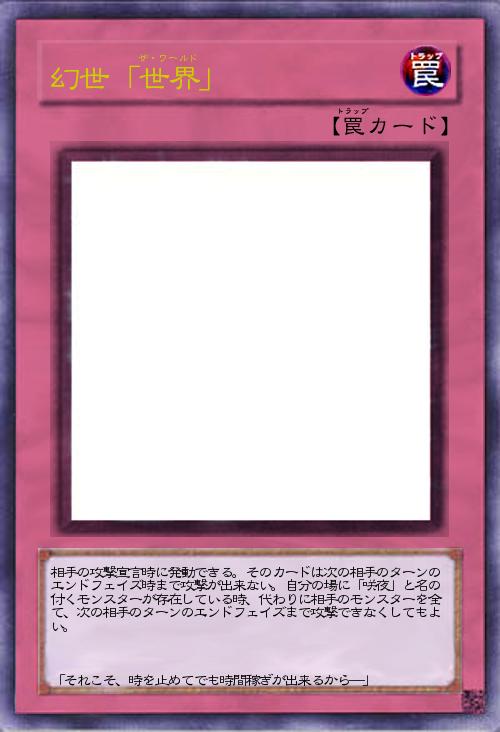 相手の攻撃宣言時に発動できる。そのカードは次の相手のターンのエンドフェイズ時まで攻撃が出来ない。自分の場に「咲夜」と名の付くモンスターが存在している時、代わりに相手のモンスターを全て、次の相手のターンのエンドフェイズまで攻撃できなくしてもよい。 「それこそ、時を止めてでも時間稼ぎが出来るから―」 |