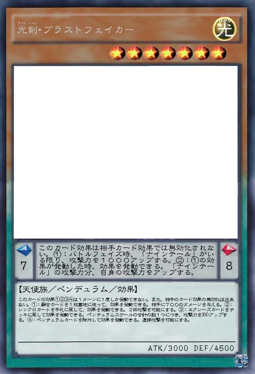 | このカードの効果①②③④は1ターンに1度しか発動できない。また、相手のカード効果の無効化は出来ない。①:融合カードを1枚墓地に送って、効果を発動できる。相手に700のダメージを与える。②:シンクロカードを手札に戻して、効果を発動できる。2回攻撃を可能にする。③:エクシーズカードをデッキに戻して効果を発動できる。ペンデュラムスケールの合計の数1つにつき、攻撃力を300アップする。④:ペンデュラムカードを除外して効果を発動できる。直接攻撃を可能にする。 | |||