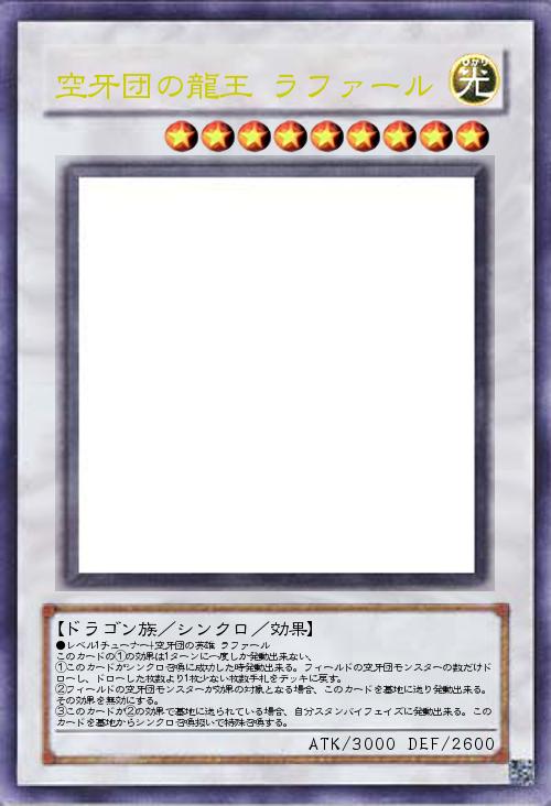 | ●レベル1チューナー+空牙団の英雄 ラファール このカードの①の効果は1ターンに一度しか発動出来ない、 ①このカードがシンクロ召喚に成功した時発動出来る。フィールドの空牙団モンスターの数だけドローし、ドローした枚数より1枚少ない枚数手札をデッキに戻す。 ②フィールドの空牙団モンスターが効果の対象となる場合、このカードを墓地に送り発動出来る。 その効果を無効にする。 ③このカードが②の効果で墓地に送られている場合、自分スタンバイフェイズに発動出来る。このカードを墓地からシンクロ召喚扱いで特殊召喚する。 | |||