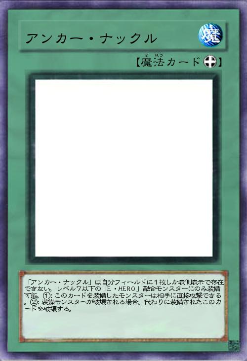 | 「アンカー・ナックル」は自分フィールドに1枚しか表側表示で存在できない。レベル7以下の「E・HERO」融合モンスターにのみ装備可能。①:このカードを装備したモンスターは相手に直接攻撃できる。②:装備モンスターが破壊される場合、代わりに装備されたこのカードを破壊する。 | |||