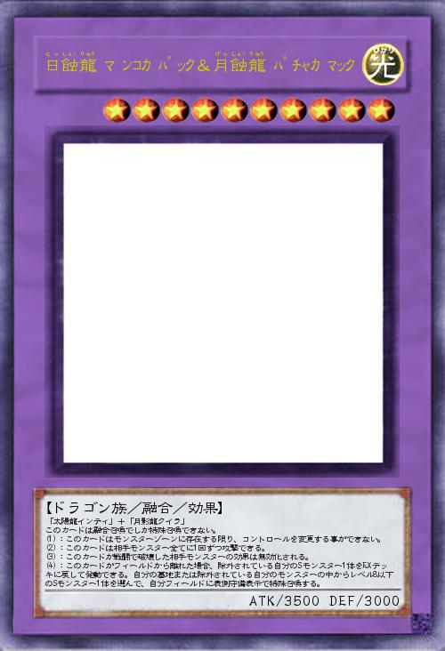 | 「太陽龍インティ」+「月影龍クイラ」 このカードは融合召喚でしか特殊召喚できない。 (1):このカードはモンスターゾーンに存在する限り、コントロールを変更する事ができない。 (2):このカードは相手モンスター全てに1回ずつ攻撃できる。 (3):このカードが戦闘で破壊した相手モンスターの効果は無効化される。 (4):このカードがフィールドから離れた場合、除外されている自分のSモンスター1体をEXデッキに戻して発動できる。自分の墓地または除外されている自分のモンスターの中からレベル8以下のSモンスター1体を選んで、自分フィールドに表側守備表示で特殊召喚する。 | |||