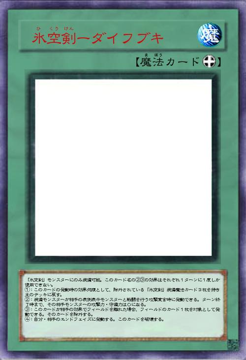 | 「氷空剣」モンスターにのみ装備可能。このカード名の②③の効果はそれぞれ1ターンに1度しか使用できない。 ①:このカードの発動時の効果処理として、除外されている「氷空剣」装備魔法カード3枚を持ち主のデッキに戻す。 ②:装備モンスターが相手の表側表示モンスターと戦闘を行う攻撃宣言時に発動できる。ターン終了時まで、その相手モンスターの攻撃力・守備力は0になる。 ③:このカードが相手の効果でフィールドを離れた場合、フィールドのカード1枚を対象として発動できる。そのカードを除外する。 ④:自分・相手のエンドフェイズに発動する。このカードを破壊する。 | |||
