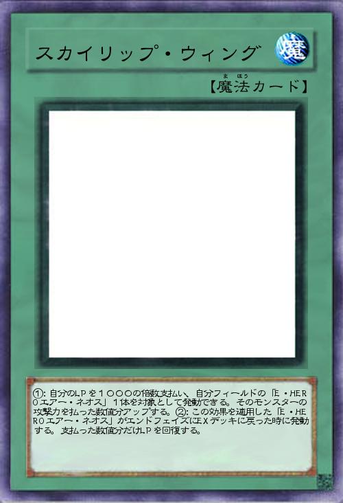 | ①:自分のLPを1000の倍数支払い、自分フィールドの「E・HEROエアー・ネオス」1体を対象として発動できる。そのモンスターの攻撃力を払った数値分アップする。②:この効果を適用した「E・HEROエアー・ネオス」がエンドフェイズにEXデッキに戻った時に発動する。支払った数値分だけLPを回復する。 | |||