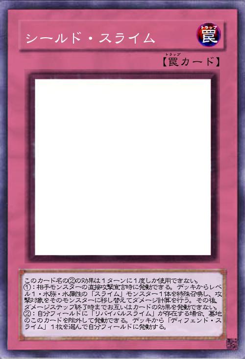 | このカード名の②の効果は1ターンに1度しか使用できない。 ①:相手モンスターの直接攻撃宣言時に発動できる。デッキからレベル1・水族・水属性の「スライム」モンスター1体を特殊召喚し、攻撃対象をそのモンスターに移し替えてダメージ計算を行う。その後、ダメージステップ終了時までお互いはカードの効果を発動できない。 ②:自分フィールドに「リバイバルスライム」が存在する場合、墓地のこのカードを除外して発動できる。デッキから「ディフェンド・スライム」1枚を選んで自分フィールドに発動する。 | |||