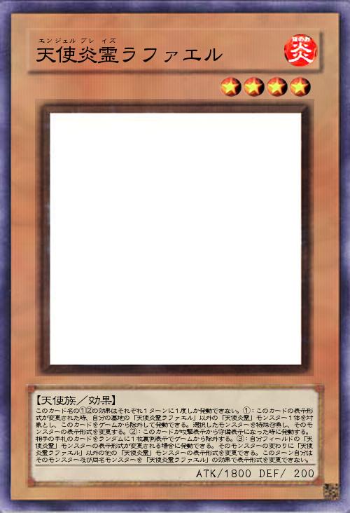| このカード名の①②の効果はそれぞれ1ターンに1度しか発動できない。①:このカードの表示形式が変更された時、自分の墓地の「天使炎霊ラファエル」以外の「天使炎霊」モンスター1体を対象とし、このカードをゲームから除外して発動できる。選択したモンスターを特殊召喚し、そのモンスターの表示形式を変更する。②:このカードが攻撃表示から守備表示になった時に発動する。相手の手札のカードをランダムに1枚裏側表示でゲームから除外する。③:自分フィールドの「天使炎霊」モンスターの表示形式が変更される場合に発動できる。そのモンスターの変わりに「天使炎霊ラファエル」以外の他の「天使炎霊」モンスターの表示形式を変更できる。このターン自分はそのモンスター及び同名モンスターを「天使炎霊ラファエル」の効果で表示形式を変更できない。 | |||