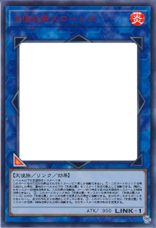 | レベル4以下の天使族モンスター1体 このカード名の①②の効果はそれぞれ1ターンに1度しか発動できない。①:このカードのリンク召喚に成功した場合、墓地のレベル4以下の「天使炎霊」モンスター1体を対象として発動できる。選択したモンスターを特殊召喚する。この効果の発動後、ターン終了時まで自分は天使族モンスターしか特殊召喚できない。 ②:このカードのリンク先の「天使炎霊」モンスターの表示形式が、「天使炎霊スローンズ」以外の「天使炎霊」カードの効果で変更された場合に発動できる。自分のデッキからカードを2枚ドローし、自分の手札を2枚選択してデッキに戻す。③:このカードのリンク先に「天使炎霊」モンスターが召喚・特殊召喚された時に発動する。そのモンスターの表示形式を変更する。 | |||
