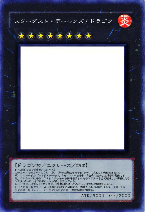| レベル8ドラゴン族Sモンスター×2 このカード名のカードの(1)、(2)、(3)の効果はそれぞれ1ターンに1度しか発動できない。 (1):このカードが「レッド・デーモン」Sモンスターを素材にS召喚に成功した場合に発動できる。このカード以外のエクストラデッキから特殊召喚されたモンスターを全て破壊し、破壊したモンスター1体につき300ポイント攻撃力をアップする。 (2):「スターダスト」SモンスターをX素材に持つこのカードは効果で破壊されない。 (3):このカードがフィールドを離れた場合に発動する。墓地からレベル8の「スターダスト」Sモンスターか「レッド・デーモン」Sモンスター1体を特殊召喚する。 | |||