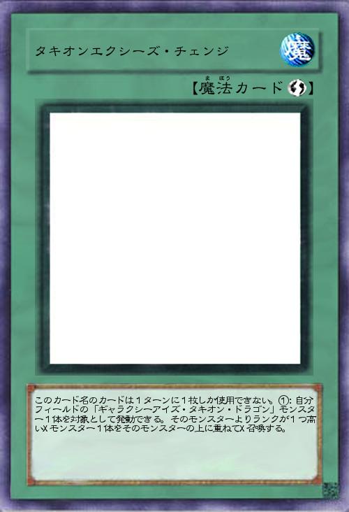 | このカード名のカードは1ターンに1枚しか使用できない。①:自分フィールドの「ギャラクシーアイズ・タキオン・ドラゴン」モンスター1体を対象として発動できる。そのモンスターよりランクが1つ高いXモンスター1体をそのモンスターの上に重ねてX召喚する。 | |||