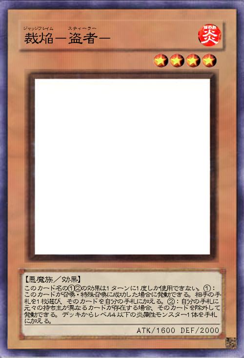 | このカード名の①②の効果は1ターンに1度しか使用できない。①:このカードが召喚・特殊召喚に成功した場合に発動できる。相手の手札を1枚選び、そのカードを自分の手札に加える。②:自分の手札に元々の持ち主が異なるカードが存在する場合、そのカードを除外して発動できる。デッキからレベル4以下の炎属性モンスター1体を手札に加える。 | |||