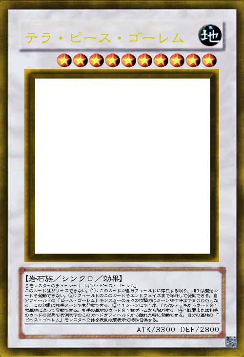 | Sモンスターのチューナー+「ギガ・ピース・ゴーレム」 このカードはリリースできない。①:このカードが自分フィールドに存在する限り、相手は魔法カードを発動できない。②:フィールドのこのカードをエンドフェイズまで除外して発動できる。自分フィールドの「ピース・ゴーレム」モンスターの元々の攻撃力はターン終了時まで3000となる。この効果は相手ターンでも発動できる。③:1ターンにで1度、自分のデッキからカードを1枚墓地に送って発動できる。相手の墓地のカードを1枚ゲームから除外する。④:戦闘または相手のカードの効果で表側表示のこのカードがフィールドから離れた時に発動できる。自分の墓地の「ピース・ゴーレム」モンスター2体を表側攻撃表示で特殊召喚する。 | |||