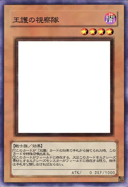 | ①このカードが「王護」カードの効果で手札から捨てられた時、このカードを特殊召喚出来る。 ②このカードがフィールドに存在する、又はこのカードをエクシーズ素材とするエクシーズモンスターがフィールドに存在する限り、相手は手札を公開しなければならない。 | |||