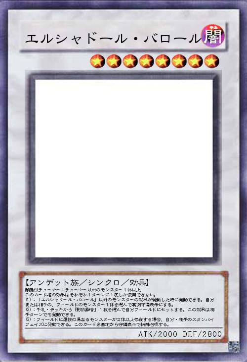 | 闇属性チューナー+チューナー以外のモンスター1体以上 このカード名の効果はそれぞれ1ターンに1度しか使用できない。 (1):「エルシャドール・バロール」以外のモンスターの効果が発動した時に発動できる。自分または相手の、フィールドのモンスター1体を選んで裏側守備表示にする。 (2):手札・デッキから「影依融合」1枚を選んで自分フィールドにセットする。この効果は相手ターンでも発動できる。 (3):フィールドに属性の異なるモンスターが2体以上存在する場合、自分・相手のスタンバイフェイズに発動できる。このカードを墓地から守備表示で特殊召喚する。 | |||