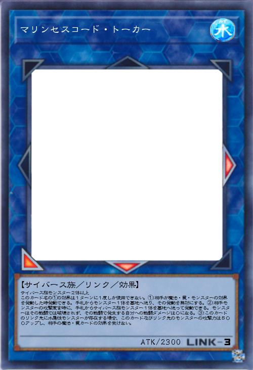 「プレイメーカーのコード・トーカーとブルーメイデンのマリンセスが合体した感じのイメージのモンスター。手札のモンスターをコストに効果の発動無効化、及びマーブルド・ロックと同様の戦闘破壊耐性とダメージシャットアウトができますがこちらはコストがサイバース限定にしてあります。リンク先に水属性モンスターがいることで自己強化と魔法・罠への耐性付加が行えます。」(2019-12-15 22:59)